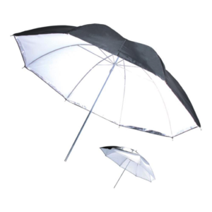 The white interior is backed with silver and black for maximum reflectance and the cover comes off if you want to use it as a shoot-through. At 40″ in diameter, this is an excellent all purpose umbrella.