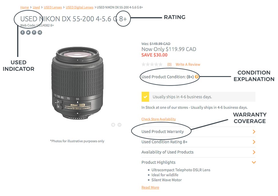 When one considers a used product from Henry’s, it’s good to know that it has been inspected by the person accepting the lens to the used program, and also by the leadership team that handles all used equipment and by the service advisors to rate the product in terms of quality. Not every piece of equipment that comes into the company as used ends up in the used department. When you look on the Henry’s website or at the used selection in the stores, you will always see a rating number. The rating is out of ten, and for resale, the product must be at least an eight out of ten or better. Products that do not meet these criteria do not go into regular used inventory. Looking at the items, we find lots of eights, lots of eight-plus and some nine ratings. What this means is a lens that is functionally new, but that may show some cosmetic wear. It does not mean that there are any defects in the lens.