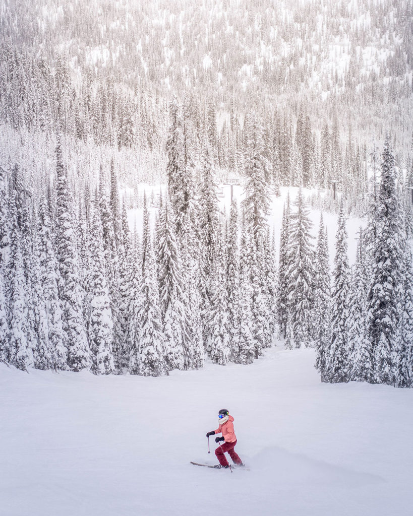 Using your camera’s exposure compensation, dial in +1 to +2 stops more light. Your objective should be to achieve the ‘whitest’ tonality of snow, while still retaining some detail. This overexposure will ensure that the snow looks white, but it won’t blow out other objects in the photo.